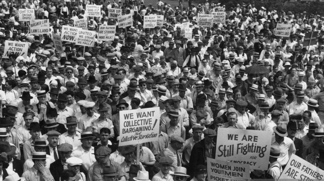 Insurgent industrial labor throughout the country was smashing at the bulwarks of the open-shop. The embattled auto workers of the giant General Motors Corporation forced signed contracts from the Morgan-DuPont financial coalition by their militant sit-down strikes.