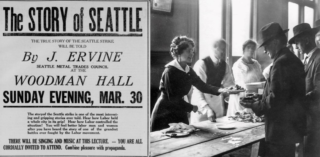 Last Sunday evening, at the Woodman Hall, Jas Irving, of the Seattle Metal Trades Council, before a crowded audience, told the story of the Seattle strike. It was a story that stirred and inspired the audience. The speaker in his own quiet way, told of how the workers of Seattle had stopped the wheels of industry and managed things themselves. It was a fine story. We enjoyed it all the more, because it was being told by one of the strikers. It was just like listening to a soldier telling you of a battle he had been in. The story was one that will ever to be remembered by the men and women who had the good fortune to hear it.