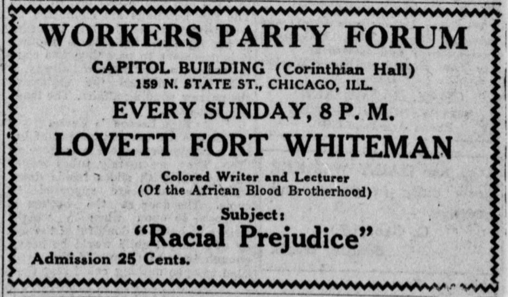 The police, the politicians, the workers who had assembled to hear the lecture, were held to close attention by Whiteman’s masterful, analysis of present world conditions. He also gave a clear conception of the Negro and his position in the imperialist society of America. The evils of segregation and Jim Crowism were bared to the people. The relation of the Negro to the 13th and 14th amendments to the constitution of the United States was shown.