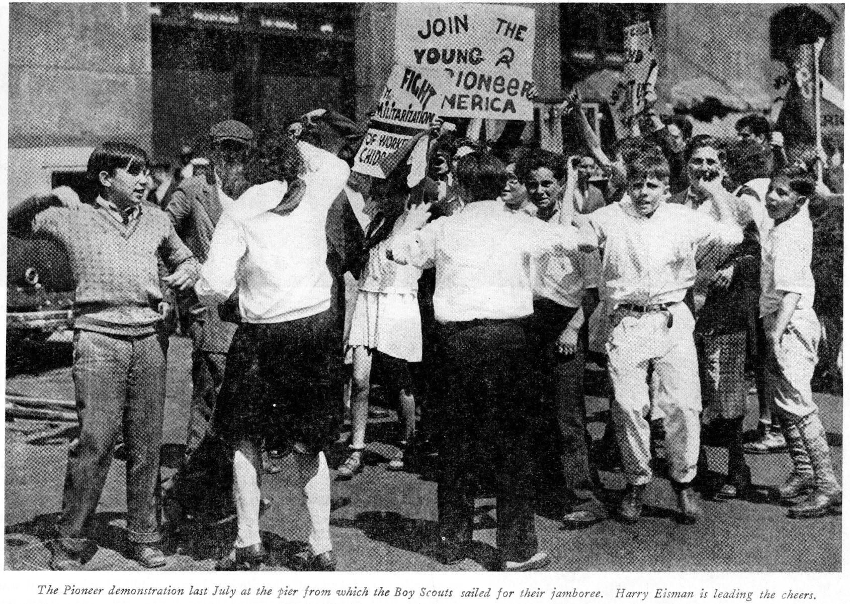 This violent campaign against workers’ children is especially aimed at members of the Young Pioneers of America. It is the Young Pioneers of America that issued special leaflets and school bulletins calling upon the workers children to participate in all workers’ struggles. It is the Young Pioneers of America that is exposing the Boy Scouts as a jingoist, anti-working class organization of the bosses to prepare the children for the coming war as well as for strike breakers. Harry Eisman was sentenced by the capitalist court to a long term of imprisonment, particularly for being a member of the Young Pioneers of America. The plutocrats of America and their government aim to drive the Young Pioneers of America into illegality. Measures are being advocated by professional pay-triots banded together in such notorious hooligan organizations as “Veterans of Foreign Wars,” “American Legion,” etc., calling for a government investigation of the Young Pioneers of America.