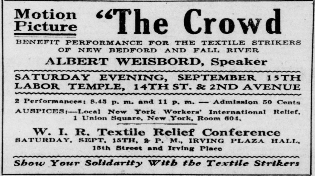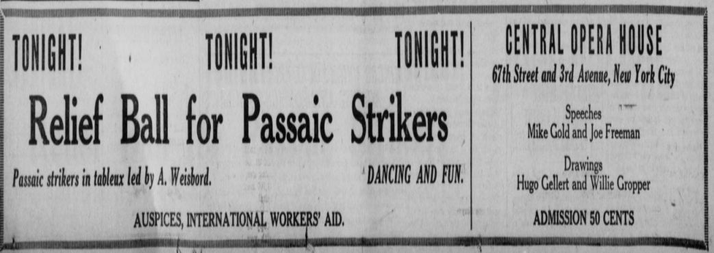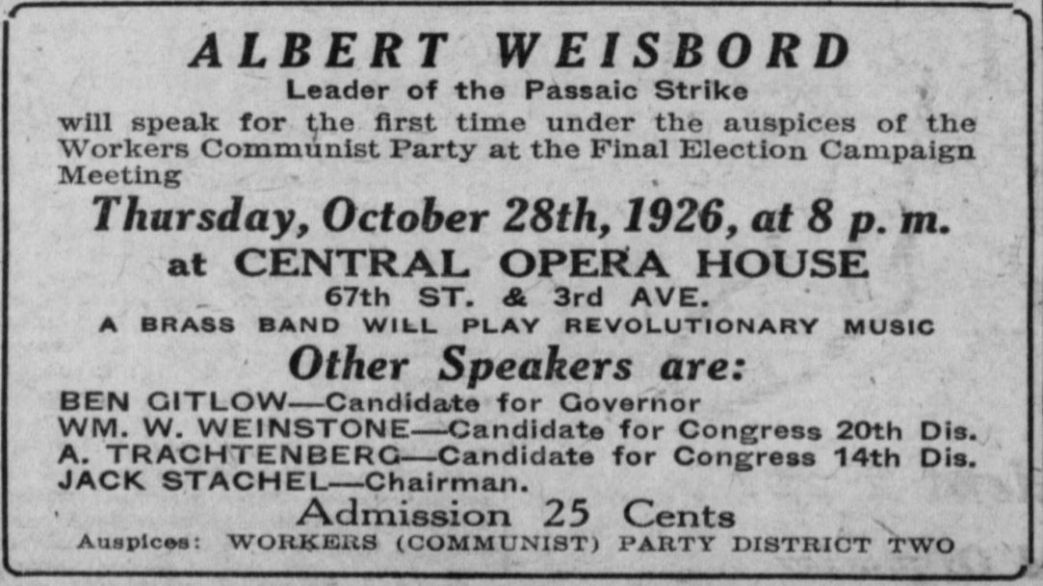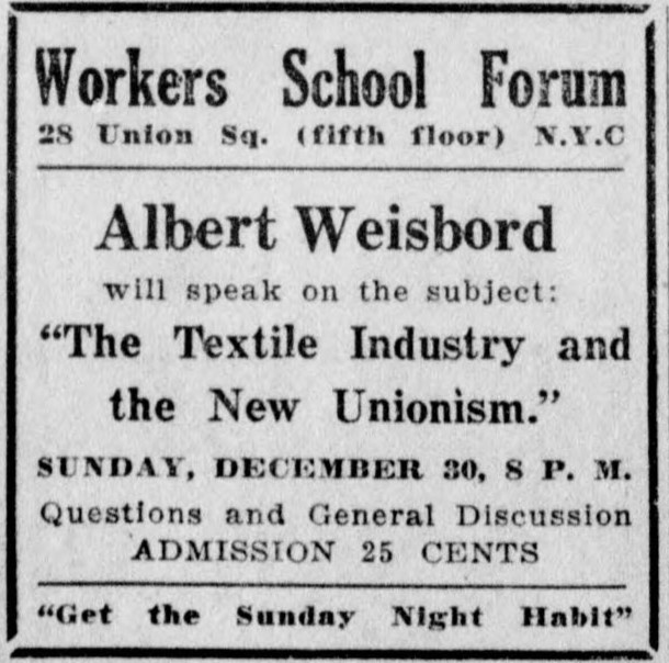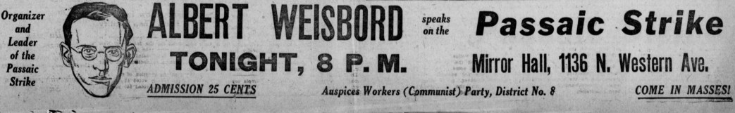 It was for this reason that as soon as I had registered my opinion with the Ruthenberg group that I left all these factional wranglings and taking the Comintern slogan “To the Masses” seriously got a job in a textile mill, learned how to weave silk, transferred to Paterson and began the work of organizing the masses and building the party.