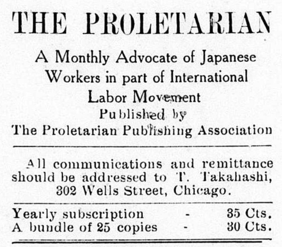 The Proletarian, a bilingual paper published in Chicago by Takeshi Takahashi for ‘Japanese members of the Industrial Workers of the World’, lasted on briefly with a few issues produced in 1909 and 1910. Takeshi came to America as a teenage anarchist, a “disciple of Denjiro Kotoku,” in 1906, and attempted to build a branch of Kotoku’s Socialist Revolutionary Party, established that year in San Francisco. The SRP and the Bay Area I.W.W. held meetings and exchanged papers and by June, 1907 the San Francisco I.W.W. was producing leaflets in Japanese. At the same time, the Socialist Party had passed anti-Asian resolutions in California and nationally. While in Chicago Takahashi’s anarchism developed into anarcho-syndicalism and he joined the I.W.W. in 1907, writing articles about Japanese labor in Hawaii and Japan. With the encouragement of Emma Goldman, Josephine Conger Kaneko and others, he launched The Proletariat in 1909. However it was only to last a year for lack of financial support.