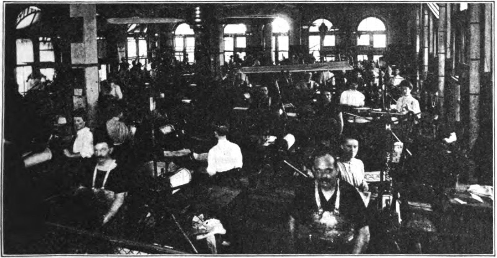 I have been through the notorious cotton mills of South Carolina. I have stood with the workers at the machines in the great shoe factories of Massachusetts, I know what it is to work, and breathe the phosphorous laden air in the Corporation match factories of the north, but I have yet to find a more congested, or foul workshop than that of the great press room at the Government Bureau of Printing & Engraving at Washington. An expert shoe stitcher can command $12 to $20 a week, the Government Bureau women are obliged to live, and pay for food, housing, and clothes, on a $9 wage a week. Let those Socialists who are clamoring for “Government Ownership” study the work conditions of those industries in Washington over which the stars and stripes wave so proudly; let them talk with these government wage-slaves and hear from their own lips, if they can, how fine a thing it is to work for the United States Government.