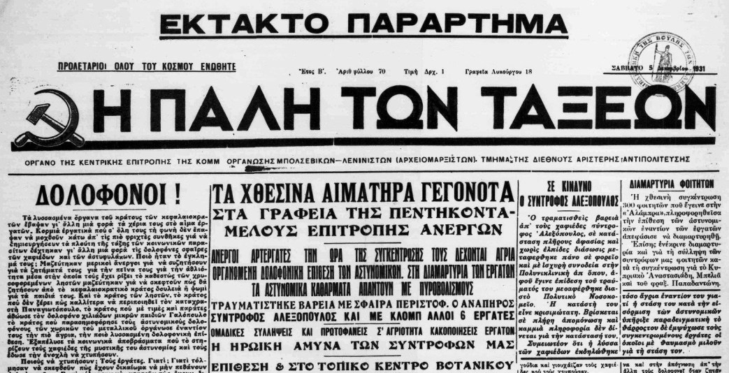 This party, without any solid working class base, followed blindly the Stalinist faction in the C.I. and transferred its slogans faithfully on Greek soil. In 1927 an opposition begins to appear against the C.P. leadership. Little by little, this opposition approaches in its criticism that of the Left Opposition in other countries. It gathers around the review ‘SPARTAKOS’ and attempts to influence the leadership and save the debris of the party. Expelled by the ever more corrupted apparatus, the SPARTAKOS group lives in the meantime only on the more or less correct interpretations of the ideas of the Russian and the International Left Opposition. It does not succeed in organizing a solid nucleus in the party, capable of drawing the class organizations after it.