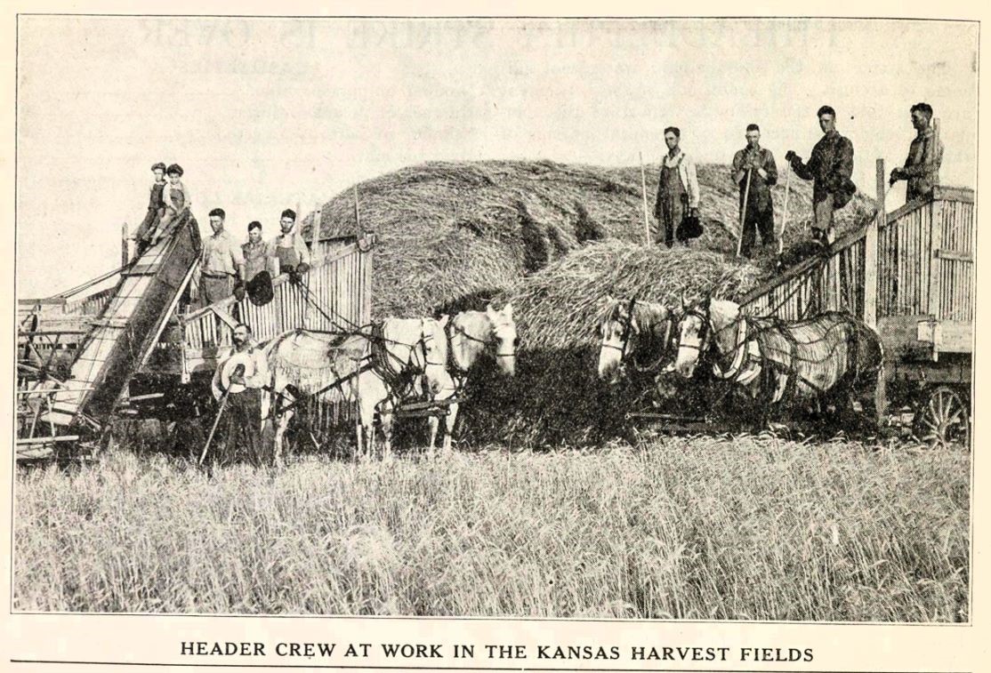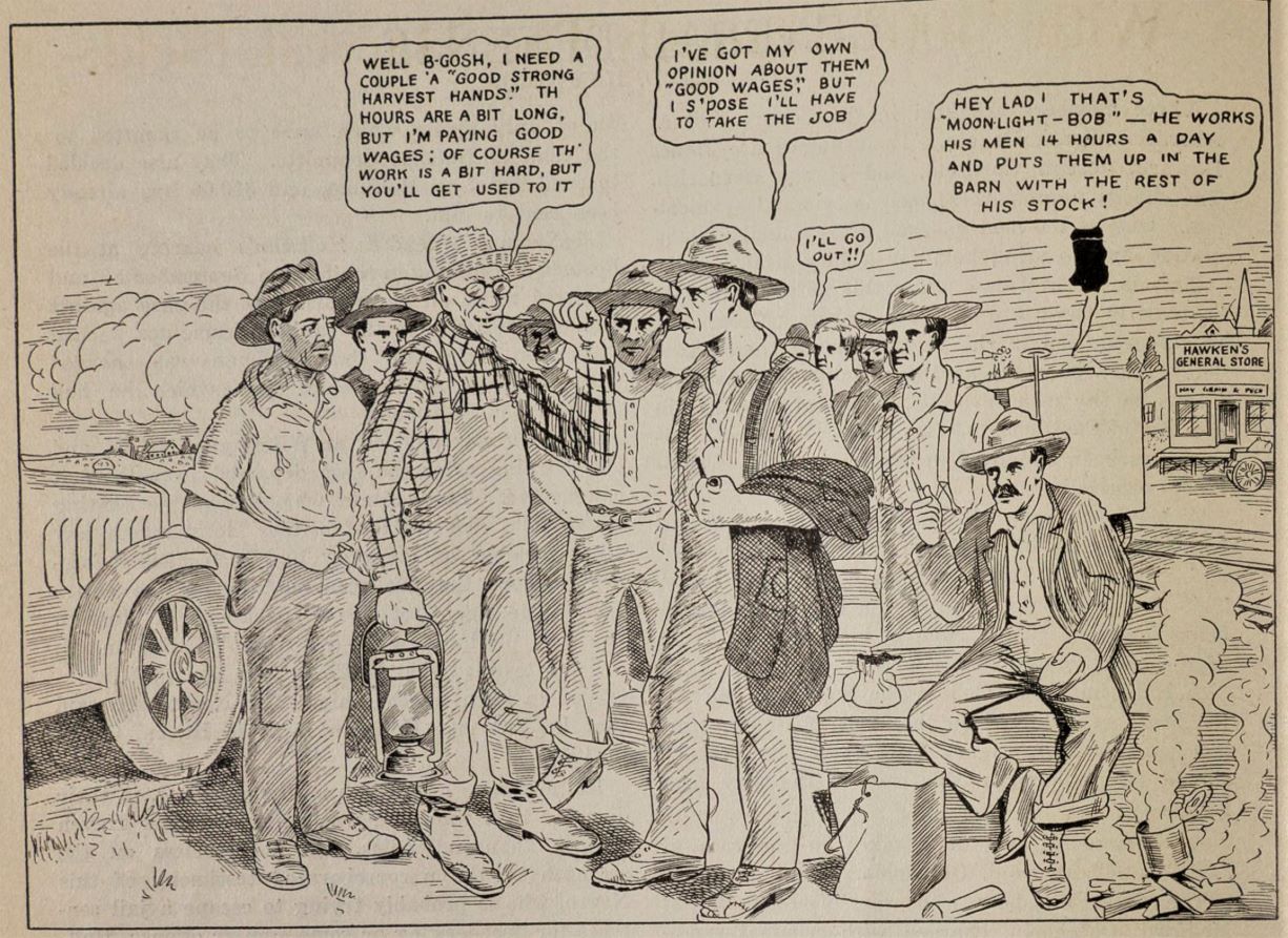 Prospects are strong that if the farmers don’t pay the I.W.W. scale the bread-basket of the world will have a terrible stomach-ache this year. Some of the threshing machines are union this year. They come to the boss wearing an I.W.W. label and to work over ten hours makes them sick. Generally they get colic about six o’clock. Belts should also get a 14-hour rest every day or they accidentally slip. The working class are voting for $3.50 for ten hours on the job, and some of the votes are registering with a bang. A brakeman asked the writer what sabotage meant after spending five hours trying to get out of town. The farmer is being educated and paying for his education. He is paying the organizers for the I.W.W.