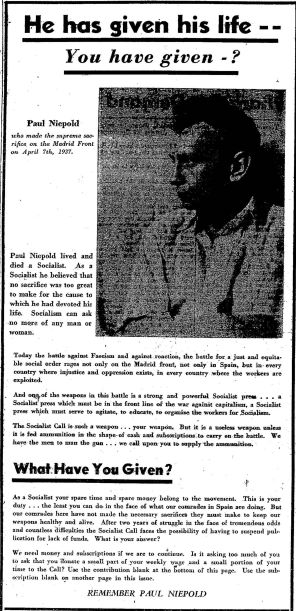 The reports of Paul Niepold’s death came as a shock to many Party members who knew him as a loyal friend and comrade; but it brought home to them in vivid fashion the necessity for aid to Spain TODAY! None of us can serve the great cause for which Paul Niepold gave his life, in a better fashion then by carrying through immediate action to help both, the Debs Column and the North American Committee.