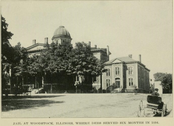 Fortunately for me and my convicted associates of the American Railway Union, the filthy Cook County jail was over populated at the time we were sentenced, in consequence of which we were transferred to the county jail in Woodstock. The farmers in that vicinity did not relish the idea of my being “boarded” among them even as an inmate of their jail. They had been reading the daily newspapers and had concluded that I was too dangerous a criminal to be permitted to enter the county, and it was reported that they would gather in numbers at the station on my arrival and attempt to lynch me, or at least prevent me from disembarking. When we arrived at Woodstock a number of them were at the station, but they had evidently been advised against carrying out their enthusiastic program for they made no hostile demonstration.
