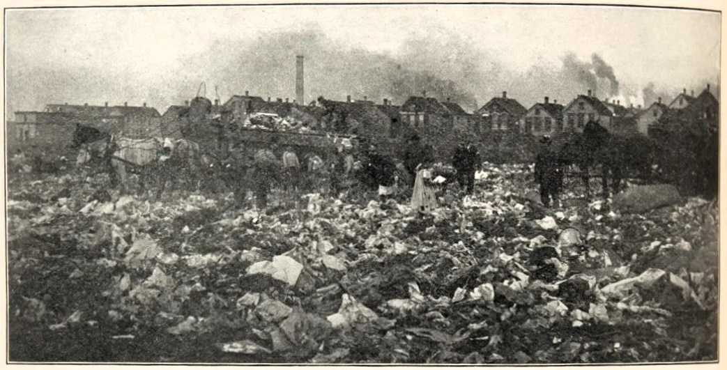 Here, too, the packing houses send non-utilizable wastes to the amount of several carloads daily. On this dump. accordingly, are piles of rotting melons, decaying fruits, spoiled vegetables, nasty slime from Heinze’s pickle works, spent hops from breweries, horse manure, putrid meat, cast-off bandages from private hospitals, and other choice putrifactions.