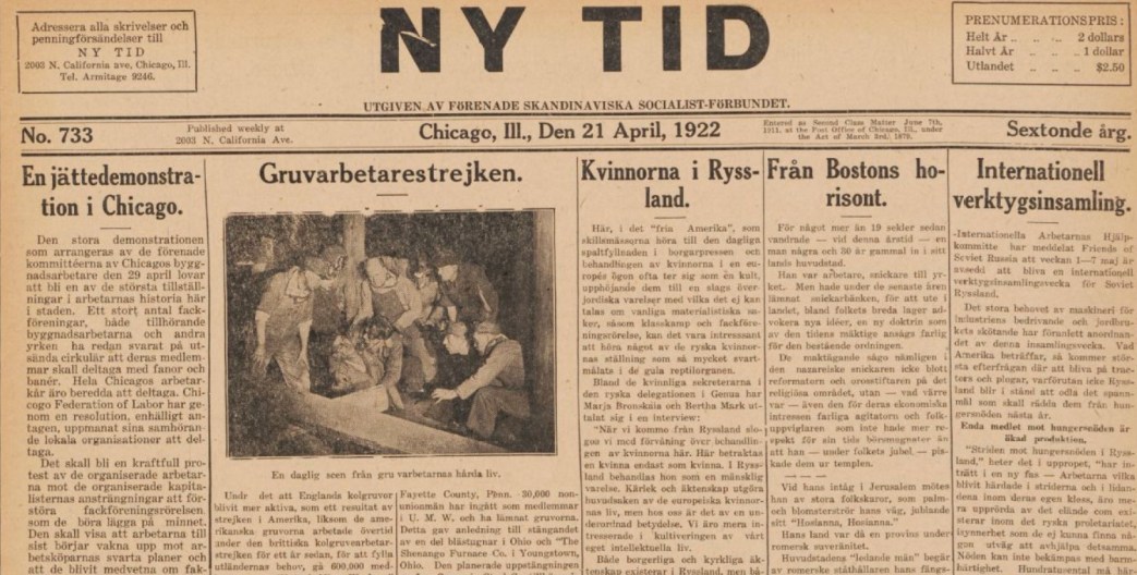 Ny Tid (New Era) was Communist weekly published in Chicago by the Scandinavian Workers’ Educational Society and included both Swedish and Norwegian/Danish content. Faction fights and Palmer raids ended Svenska Socialisten by 1920, but was reborn as the pro-Communist Facklan (‘The Torch’) in 1921 after the majority of the Left Wing SSF were expelled from the SLP. After the SSF merged with the Workers (Communist) Party the paper was renamed Ny Tid (New Era) in 1922 as the organ of the CP’s Scandinavian Federations moving to New York City in 1931. There, along with Swedish, the paper published sections in Norwegian, Danish, and English. It’s circulation was around 5000. Ny Tid ended its run in 1936. Editors included Oscar W. Larsen (1922), Charles Fredzen (1922), Daniel Birgers (1922–1925), Allan Wallenius (as “Ellis Peterson”) (1925–1929), and Albert Pearson (1929–1936).