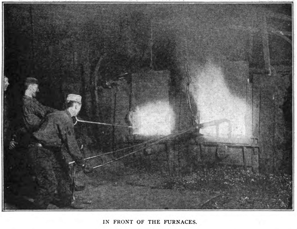 For the production of a high grade of steel the open hearth furnace are coming into general use. By this process the metal is decarbonized by boiling it from twelve to eighteen hours. The result is steel for guns, tools, etc. In the Southern mills in Alabama, steel rails are made by this process. There is less danger for the men at the open hearth furnace although accidents are frequent and the heat is so intense that prostrations are of common occurrence.