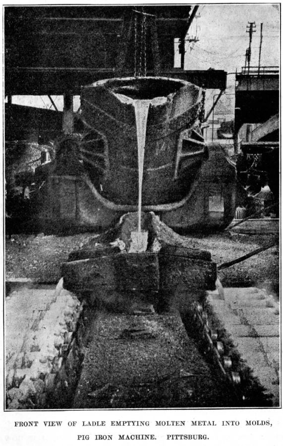 At the Homestead plant, the primitive method of tempering mixture is used “dry” and shoveled into the indescribably hot depths below by a workman who stands a few feet from the great converter as it is tipped to pour the stream of steel into the ladle below. From eight to ten times an hour this man works hard shoveling chemicals face to face with heat so intense as to beggar description.