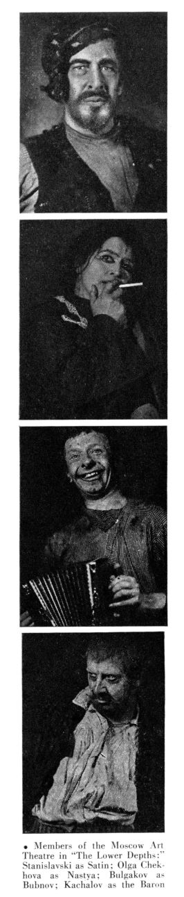 While Smug Citizens was opening the season at the Moscow Art Theatre, they were already rehearsing a still greater play: The Lower Depths. Gorki came to Moscow to read to them the manuscript of his masterpiece. Chaliapin and Andreyev as well as the actors of the Art Theatre were there to listen spellbound to his reading. Kachalov, perhaps the greatest living actor of today, tells how Gorki read “beautifully” and how, when he came to the scene where the pilgrim, Luka, tries to console old Anna on her deathbed, the actors held their breath in stillness and Gorki’s own voice trembled and broke as he cried “The Devil take it!” and wiped away a tear with his finger, ashamed to let them see how much he was being affected by his own play.