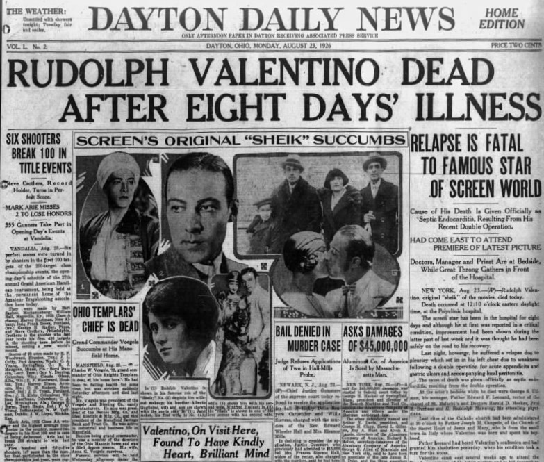 Thus the daily press records the passing of Rudolph Valentino as “Millions of Women Weep” for “The Greatest Lover of the Screen” as the headlines tell the story.