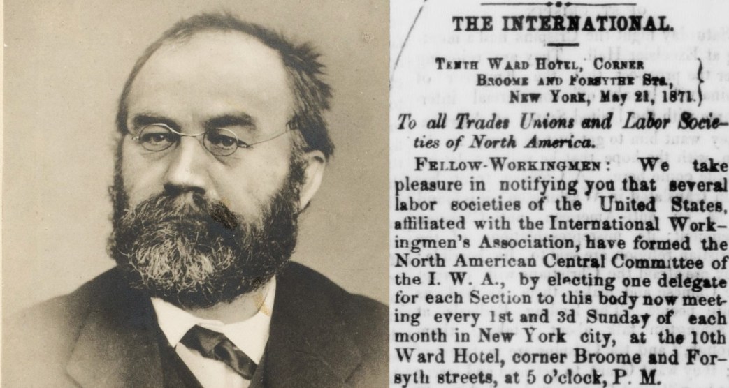 We take pleasure in notifying you that several labor societies of the United States, affiliated with the International Workingmen’s Association, have formed the North American Central Committee of the I.W.A., by electing one delegate for each Section to this body now meeting every 1st and 3d Sunday of each month in New York city, at the 10th Ward Hotel, corner Broome and Forsyth streets, at 5 o’clock, P.M.