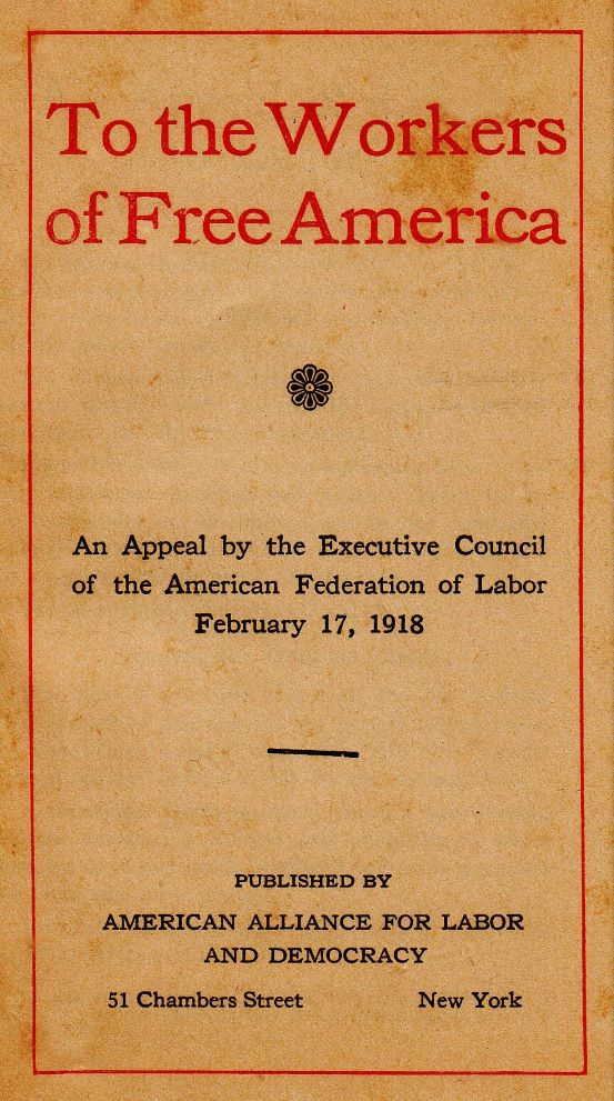 “The undersigned hereby affirm that it is the duty of all the people of the United States, without regard to class, nationality, politics or religion, faithfully and loyally to support the government of the United States in carrying on the present war for justice, freedom and democracy to a triumphant conclusion, and gives this pledge to uphold every honorable effort for the accomplishment of that purpose, and to support the American Federation of Labor, as well as the declaration of organized labor’s representatives, made March 12, 1917, at Washington, D.C., as to ‘labor’s position in peace or in war,’ and agrees that this pledge shall be his right to membership in this conference of the American Alliance for Labor and Democracy.”