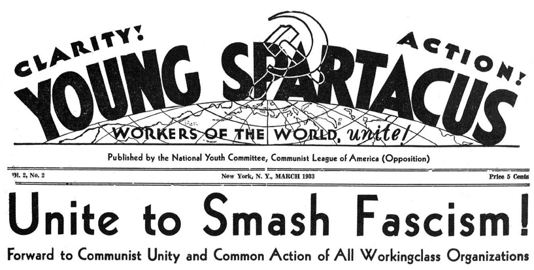 Young Spartacus was first published by the National Youth Committee, Communist League of America (Opposition), in New York City. A semi-monthly from 1931 until the end of 1935. The Spartacus Youth Clubs and then the Spartacus Youth League would be organized and publish Young Spartacus before the movement entered the Socialist Party and Young People’s Socialist League in 1936’s ‘French Turn.” For must of its run, as with its parent organization, Young Spartacus was aimed at supporters and the milieu of the Communist Party and the Young Communist League of which it viewed itself as an opposition. Editors included Manny Garrett, Martin Abern, Max Shactman, Joseph Carter, and George Ray.
