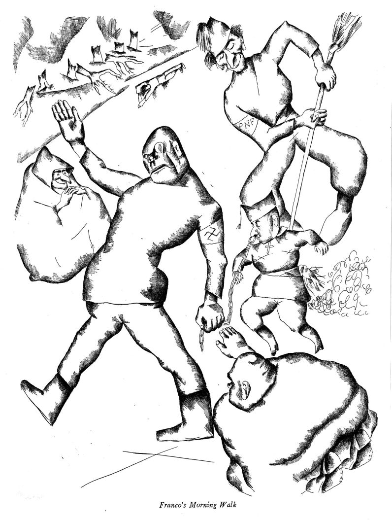 The third drawing depicts Franco, the great patriot and führer, taking his morning walk, led by a chain and nose-ring by one of Hitler’s prize Nordics, propelled from behind by a broom in the hands of one of Mussolini’s jolly Aryans. Broken trees and a corpse are in the background, and in the middle distance the familiar figure of ignorance and superstition. Hypocrisy kneels and gives the fascist salute as the self-appointed dictator passes by. Keen observers will notice a spider web.