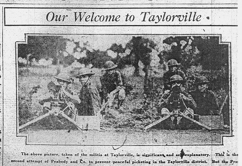 Next morning three deputy sheriffs set out from the No. 7 mine heavily armed and with lowered windows on their car. These three, Fulton Smith, Harry Hilmers, top foreman at the mine, and James “Guy” Hickman, a Peabody strike breaker, were recently imported from West Virginia.