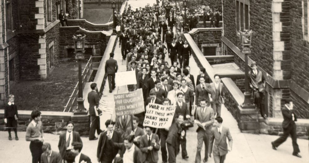 City College of New York was one of the most radical campuses of the 1930s. Here students strike demanding the reinstatement of students suspended for anti-war activity and the abolishing of R.O.T.C. on campus. As today, the police attacked.
