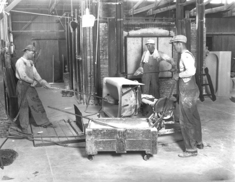 The cost of the tub varies according to the number and quality of the coats of enamel. The last coat is especially difficult to put on. The men are obliged to bend over with their faces fairly inside the tub and to work with the utmost nicety. A little dirt, a tiny bubble hole in the enamel is noted by the inspector, and the tub is thrown out. Although it is hard for eyes which have been strained in intense heat for hours to detect bubbles, and although the enameller is not to blame for dirt in the powder, the men say they receive nothing for defective tubs.