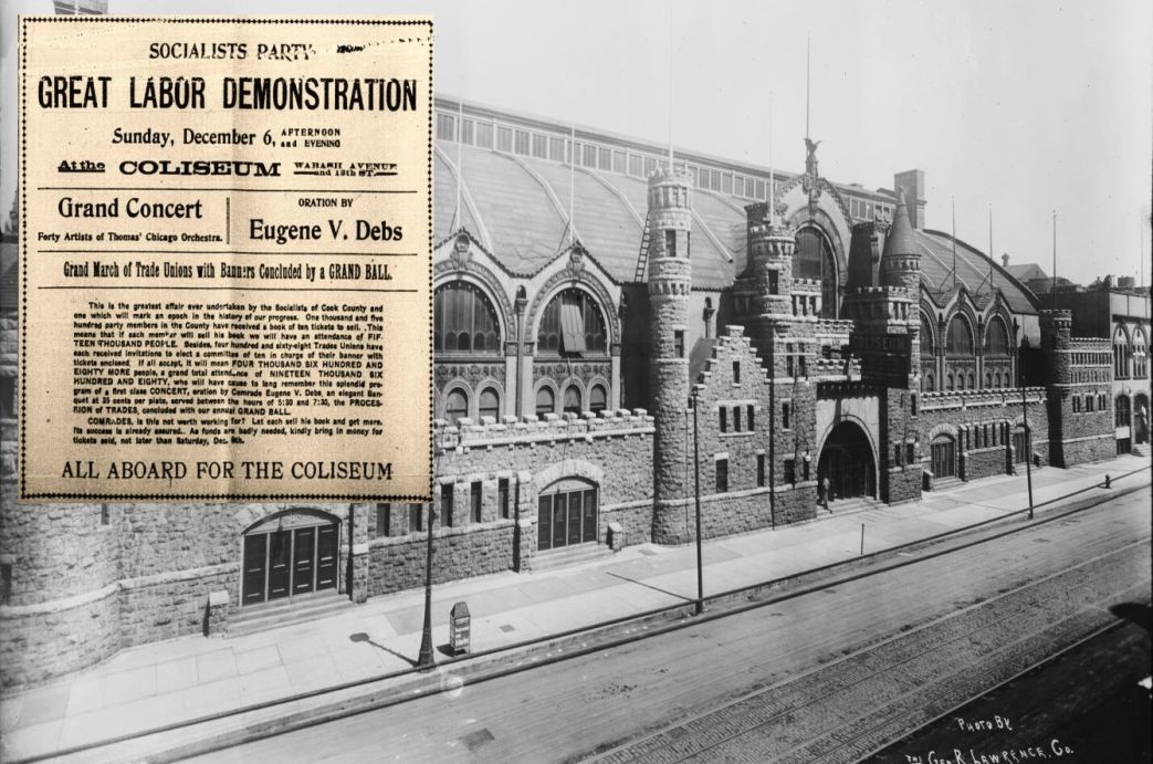 In the winter of 1903, ten thousand Chicago socialists attend a two hour oration by Eugene V. Debs at the city’s Coliseum, with a program of music, marching, a banquet and dancing.