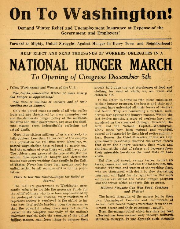 The first National Hunger March departed in four columns toward Washington D.C. on November 29, 1931 where they would gather a week later. Below are reports from each column on the beginning of their journey.