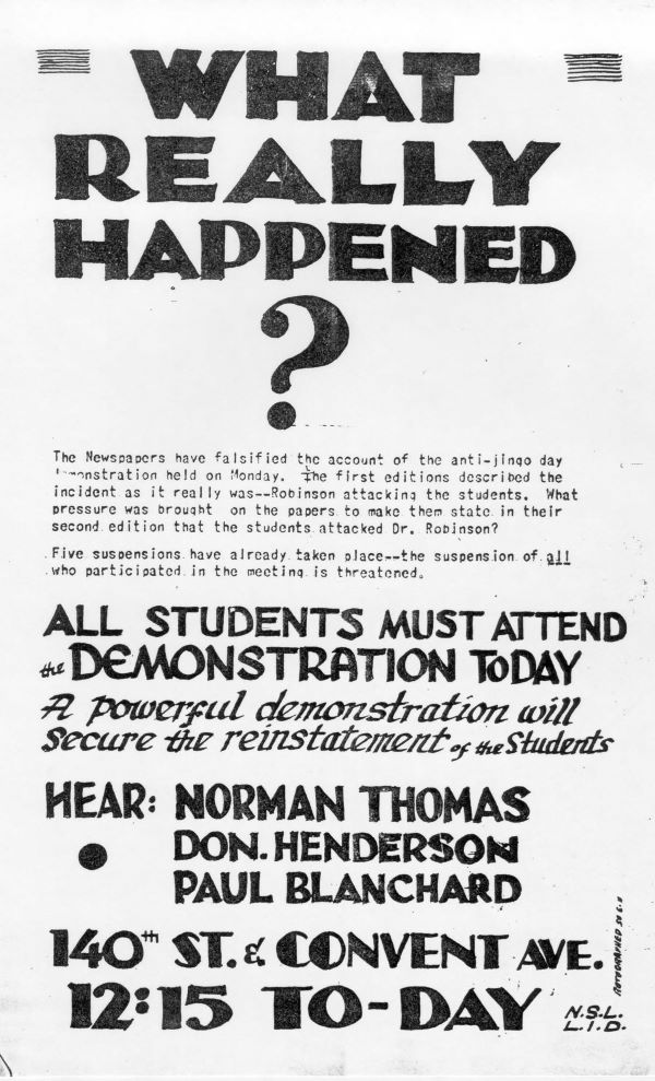 These conflicting stories, while they revealed the servile role of prostituted journalism, served only to confuse the real issues in the minds of the people of New York. Obviously, the unscrupulous distortions of the facts had their root in the tissue of falsehoods President Robinson broadcast via the press on May 30th: “I was escorting a group of guests, mostly ladies, to the Stadium and as we approached the Amsterdam Avenue and 138th Street entrance, a crowd blocked the way. This crowd began a demonstration aimed particularly at our Professor of Military Science and Tactics, Colonel Lewis, and charged forward. I did not recognize most of them. They were probably Communists from outside, although I did recognize one individual as a student of the College. As they came forward I ordered them back, but they rushed on, and in order to protect our guests it was necessary to clear the path which I did with my umbrella. The guests then passed into the Stadium.” (Italics ours).