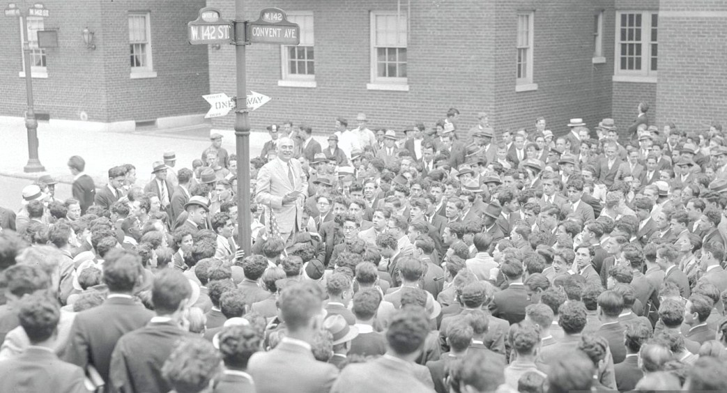 Then came the parade…. Hats off, our flag is flying high… and the rumble of the drums…the brown cheese cloth uniforms and the blue lapels…the Sam Brown belts. Flanked by blue-coated police, the R.O.T.C. assembled close by where the student. orators were inveighing against the Military Science course. The police instructed the mass meeting, now grown to considerable proportions, to move on. It moved. A half block away, at the top of the hill, on Amsterdam Avenue, the meeting reassembled. The students voted to run a picket line around the stadium. With placards raised they proceeded in double formation around 138th Street and Convent Avenue; thence to 137th Street where the line wheeled about and marched back to 138th Street. At this point, police intervened, ordering the parade to disband. With renewed militancy, the line held intact, continuing unmolested up 138th Street to Amsterdam Avenue. Somebody shouted, “Let’s go into the Stadium. We were all invited.”