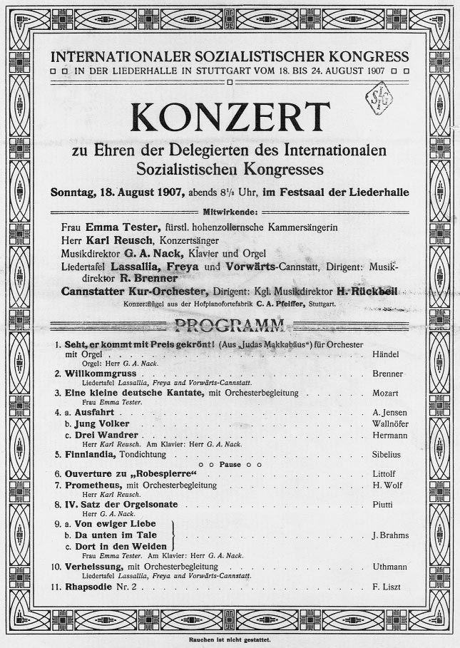 After all this, I am fully justified if I say: The International marches on! With every year it gains new ground! Already today there are at this Congress representatives from all the five continents of the globe. It will be not very long before every state of the world will also be represented. Thus we see before us a strong, mighty party, rushing forward, fully conscious of its purpose. And so I hope that the labors of this Congress will contribute to nourish and to strengthen the International and to procure new adherents to the great ideas and objects which it aims at. I hope that this Congress here in Stuttgart will produce a different example of international opinion from the international of the governments which meet at the Hague and hold sittings upon sittings, resulting finally in this pregnant mountain giving birth to a wee little mouse, and even this wee little mouse may be still-born. (Hilarity.) But as for us. let us go to work joyfully, sure of purpose; and, as a sign of your assent, I beg you to join me in the cry: “Hurrah for the Social Democracy, the deliverer of nations, of humanity!”