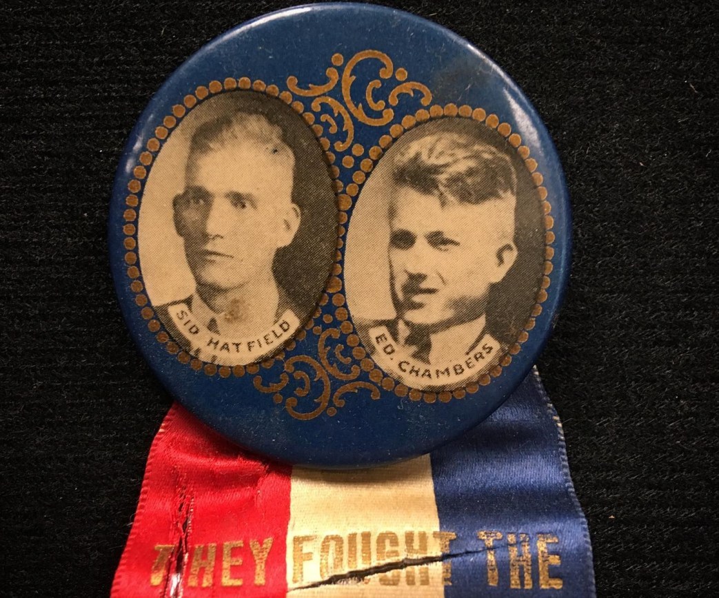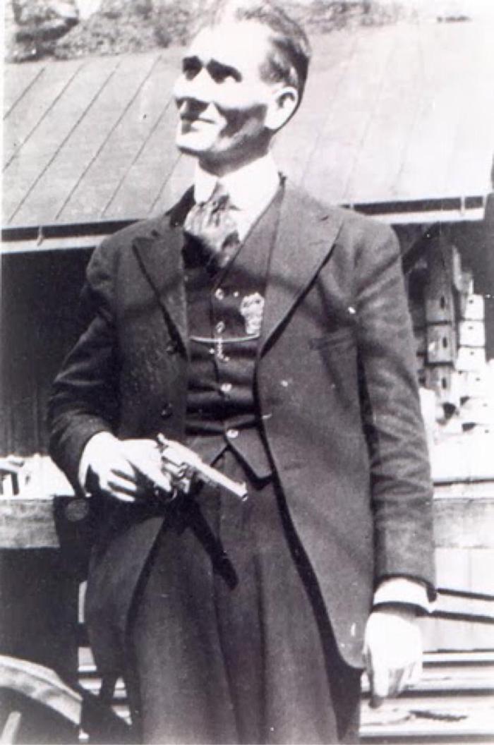 Toward nine o’clock I saw, standing near the railroad track, a middle-sized man of age about twenty-two. Although this man was alone, he was continually smiling. When he moved, his vest was displaced and exposed two Smith & Wesson revolvers, one stuck into each side of his trousers; A coal digger introduced him as Chief of Police Sid Hatfield.
