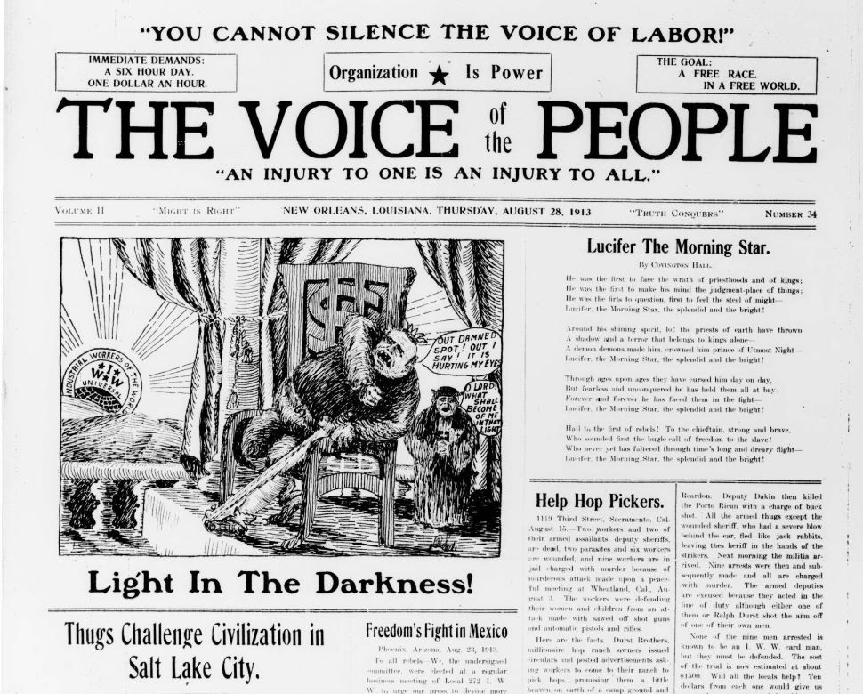 The Voice of the People continued The Lumberjack. The Lumberjack began in January 1913 as the weekly voice of the Brotherhood of Timber Workers strike in Merryville, Louisiana. Published by the Southern District of the National Industrial Union of Forest and Lumber Workers, affiliated with the Industrial Workers of the World, the weekly paper was edited by Covington Hall of the Socialist Party in New Orleans. In July, 1913 the name was changed to Voice of the People and the printing home briefly moved to Portland, Oregon. It ran until late 1914.