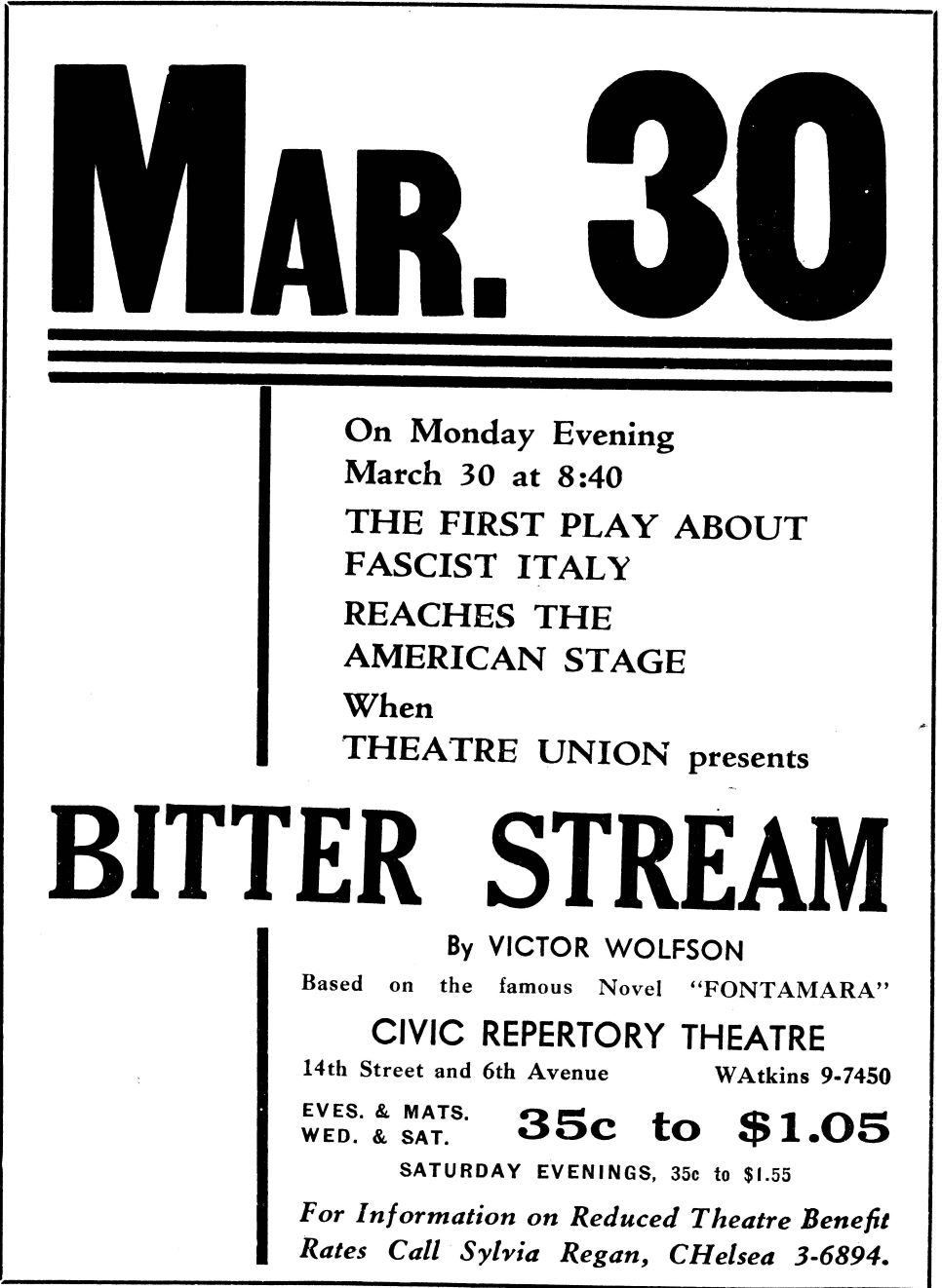 The Theatre Union’s production of “Bitter Stream,” the play by Victor Wolfson based on the novel. “Fontamara,” by Ignazio Silone, which opens Monday evening. March 30th, at the Civic Repertory Theatre–and will be seen before that date by those who attend the preview performances given under the auspices of the Socialist Party, March 26-27-28–adds to this number and is the first play about Fascist Italy to be shown on the American stage.
