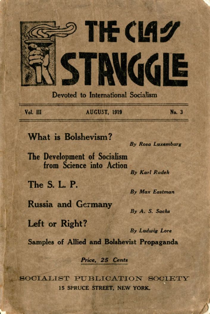 The Class Struggle is considered among the first pro-Bolshevik journal in the United States and began in the aftermath of Russia’s February Revolution. A bi-monthly published between May 1917 and November 1919 in New York City by the Socialist Publication Society, its original editors were Ludwig Lore, Louis B. Boudin, and Louis C. Fraina. The Class Struggle became the primary English-language theoretical periodical of the Socialist Party’s left wing and emerging Communist movement. Its last issue was published by the Communist Labor Party of America.