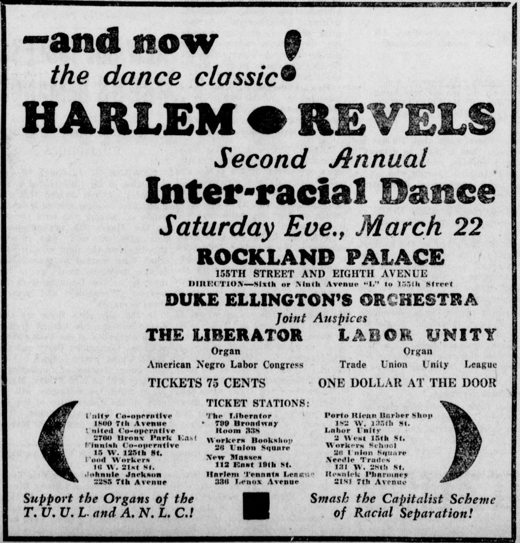 Duke Ellington, one of the greatest musical artists of the 20th century, plays an inter-racial, joint benefit for the Trade Union Unity League and the American Negro Labor Congress in Harlem.