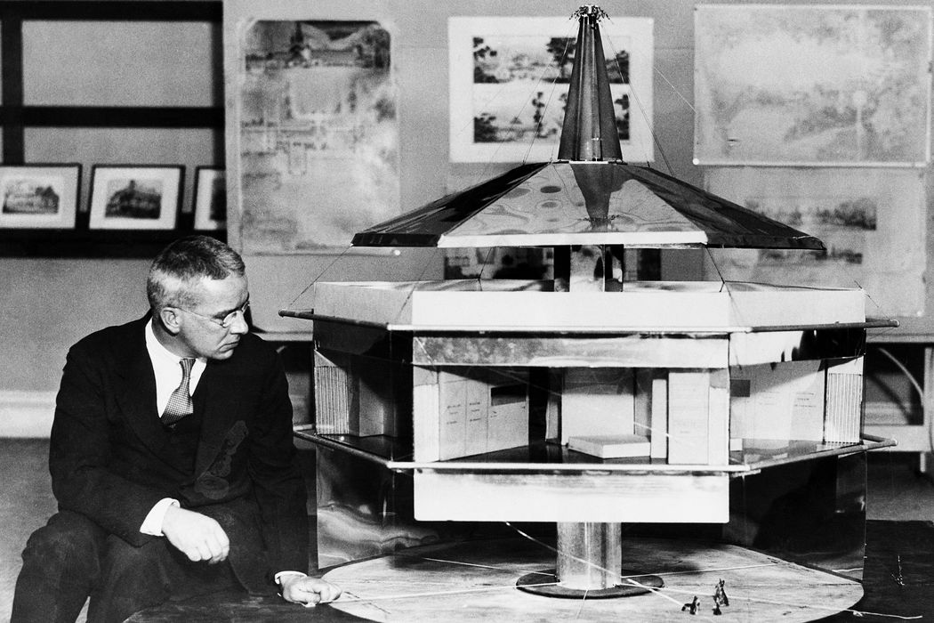 Despite Mr. Larson’s lyrical rejection of the “physical,” Mr. Fuller guarantees us that the new improvements in housing “today are in the hands of the most advanced scientific circles, such as those which establish the mechanical compositions of light or sound sensitive vibration cells.” What he means is that projects for profitable cheap housing are being studied in the laboratories of the General Motors Company, A.O. Smith Company, etc.
