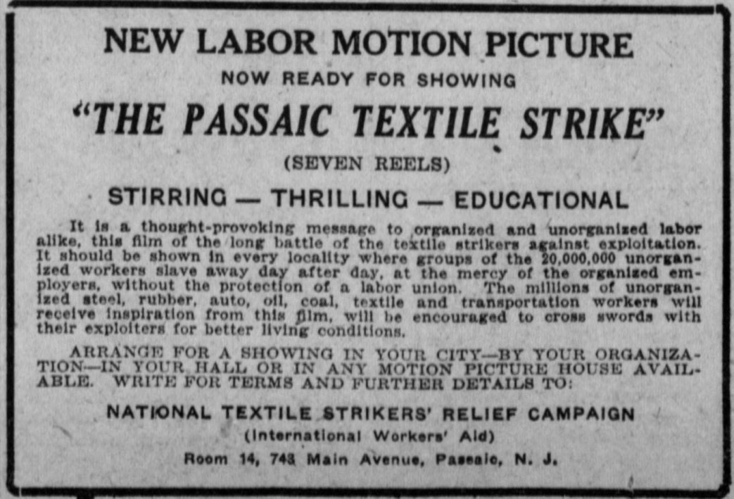 “The result is the remarkable film that is still drawing large audiences in many places. Numbers of workers have seen it several times. It is now the principal source of relief funds for the Passaic workers, who have settled their strike with most of the mills but are now disastrously hit by unemployment.”