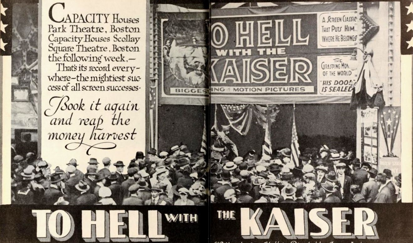 Governmental organization found incentive in conjunction with England, citizen bodies and film corporations. An American Cinema Commission went abroad. England had organized one with eminent individuals like Conan Doyle. D.W. Griffith not only was at work in England on Hearts of the World, but he also cooperated with high society in recruiting British sentiment. The National Association of the Motion Picture Industry, William A. Brady president, was organized but never functioned, although it served as a stimulant to the movie companies’ enthusiasm. The Red Cross had begun to use films but not satisfactorily enough. With Creel’s Committee on Public Information, the Red Cross set up the Division of Pictures, which released four films to one-third of the movie houses, “about the same number of audiences as Chaplin audiences.” In New York there was the Mayor’s Committee of National Defense, Jesse L. Lasky, motion picture chairman. The movie companies organized a War Cooperative Council. In 1918 the films were said to have put about $100,000,000 into the war chest. Movie stars spoke and carried on for the Red Cross, the Liberty Loan and enlistment. A propaganda slide in the cinemas read: “If you are an American, you should be proud to say so.” The sale of Liberty Loan bonds was helped by 70,000 slides. Douglas Fairbanks jumped from a roof for $100 for the Red Cross, and Chaplin sold autographed halves of his hat. The movie-actors joined the California Coast Artillery, others organized the Lasky Home Guards. Lasky received a title for his work in many divisions. His cooperation with the Government was balanced after the war by the Government’s willingness to help in the aviation film, Whigs. The popular star, Robert Warwick, now a Captain, was quoted in the fan-press upon war’s ennobling qualities.