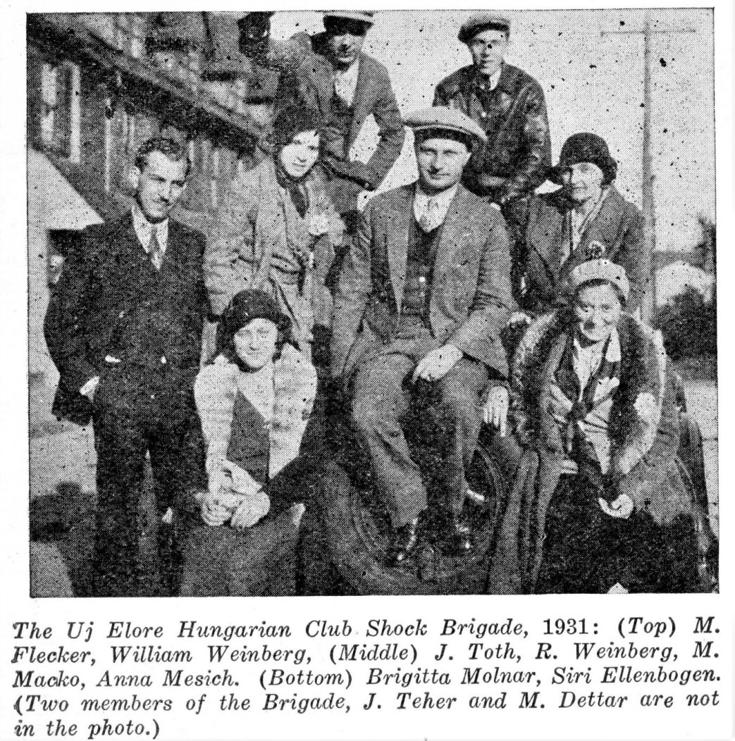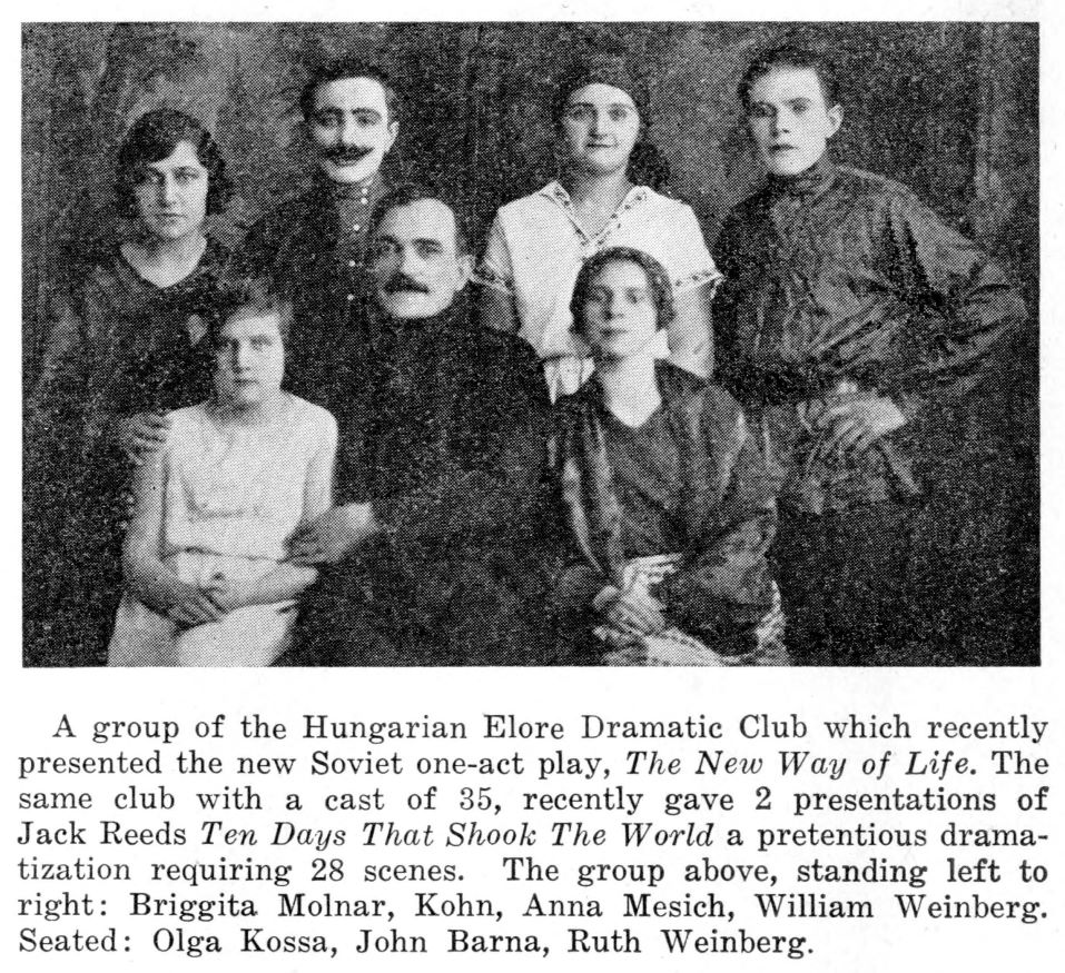 Getting subscription for our daily the “Uj Elore” and selling various kind of communist literature besides is not an easy burden to carry. Our homes, clubs numbering about a hundred also need attention. The financial burden falls in a good measure on the theatrical groups, of course. The Hungarians do their share generously in the international struggle of the workers without thinking for a moment that their heroic struggle would interest anyone else besides themselves. This is erroneous of course and with this writing we will break the ice which isolated us from the international workers theatre movement of the world.