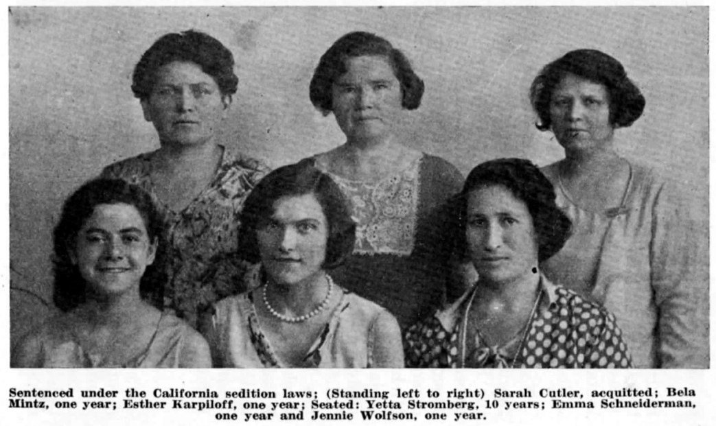 The trial of Jennie Wolfson, Bella Mintz, Sarah Cutler, Isadore Berkowitz, Esther Karpiloff, Emma Schneiderman and Yetta Stromberg exemplified the capitalist justice doled out to class conscious wokers by the capitalist court. As a result of the trial all except Sarah Cutler, who was visiting at the camp when arrested, were convicted by the supposedly “unprejudiced” jury composed of bankers, retired engineers and ranchers. During the development of the trial the Communist Party was definitely put on trial. Those on trial were not tried and convicted because of their actions or activities at the camp, but because of any radical thoughts or ideas which they might possess. The actual camp issue became submerged and Communism became the predominant issue.