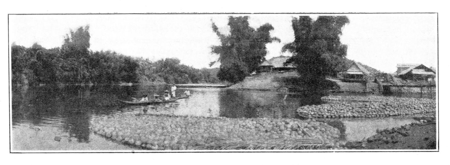 From the matured nut the Filipino drinks the rich milk and eats the soft white meat, both excellent articles of food. And let it be recorded here that a cocoanut just off the tree is vastly different in quality from the dried specimen you pay a dime for at home. The milk of the fresh nut is thicker and sweeter and the meat is much thicker and softer and more palatable than that obtained from the nut after it has been shipped across the sea and stored for months in warehouses. From the coir, a tough fibrous jacket two or three inches thick which covers the nut, matting and cordage is made. And the shell is made into cups, ladles, bowls, spoons and useful articles of every description.