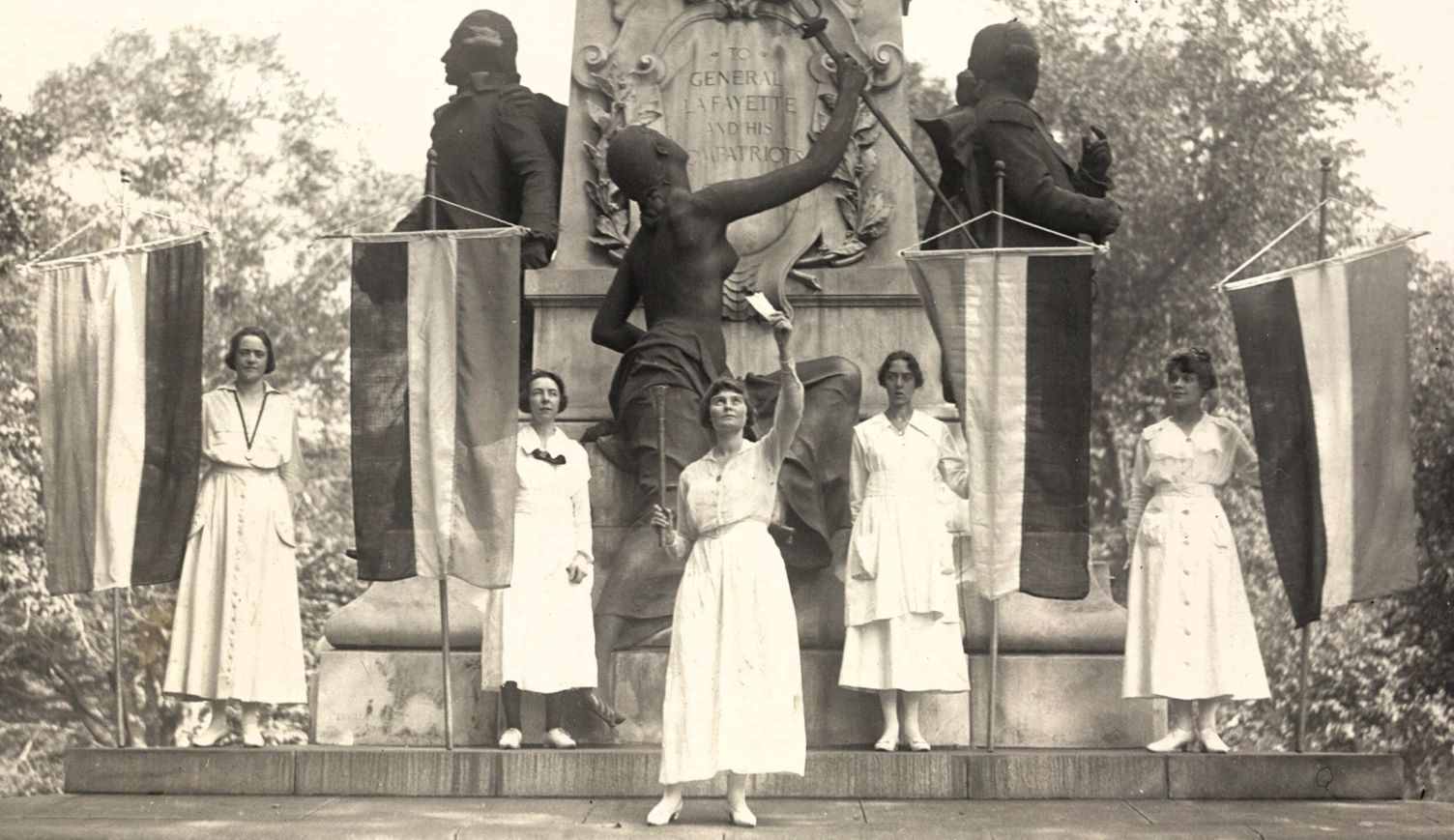 From beginning to end Alice Paul was never in evidence. But Jane Addams was there to say the first words. The name of the President’s daughter appeared on the program. The press announced that Mrs. Harding endowed the affair with her official blessing. The Speaker of the House, who had fought the Party for eight years, graciously consented to receive the statues. No, Alice Paul was not there,—even the Woman’s Party figured with one silent banner among hundreds–but the General Federation of Women’s Clubs was there, the Association of Collegiate Alumnae was there, the Eastern Star was there, the Maccabees were there, the Army Nurses and the Navy Nurses, the Republican Women and the Democratic Women, the Daughters of the Revolution, the Daughters of the Confederacy, the Congress of Mothers, all, all were there, and dozens and dozens of others, those who had scorned and condemned when the pickets stood for months at the White House gates, when they insisted on going to jail and starved themselves when they got there, all these came now with their wreaths and their flowers and their banners to celebrate the victory.