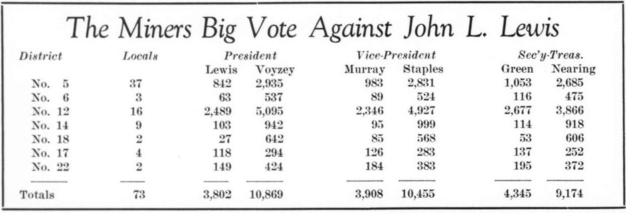 Although Voyzey and most of the other candidates of the left wing are working miners and comparatively unknown to the union at large, they have polled a very heavy vote, if they have not actually defeated the Lewis candidates. This response from the rank and file is due to the flaming discontent of the membership at the policy of betrayal by their officials, one illustration of this discontent being the present outlaw strike in the anthracite coal regions. The fragmentary returns printed below will give an idea of the left wing strength in the election.