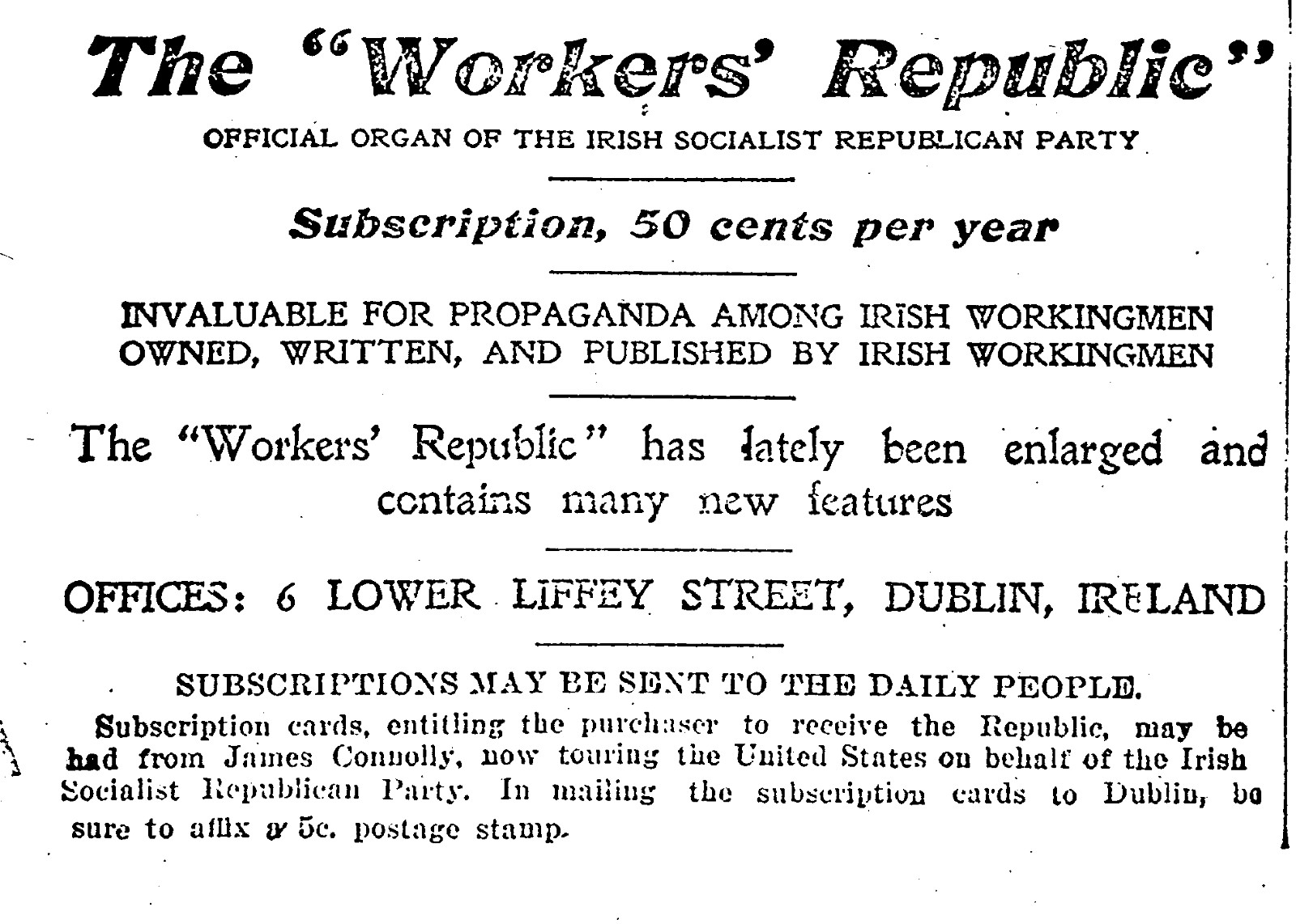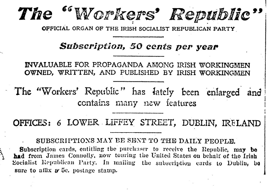 Founded in 1896 by James Connolly and others, the Irish Socialist Republican Party was warmly greeted and promoted by the Socialist Labor Party in the U.S. as a vehicle for reaching the millions of Irish-American workers, who in their mass had largely stood outside the Socialist movement.