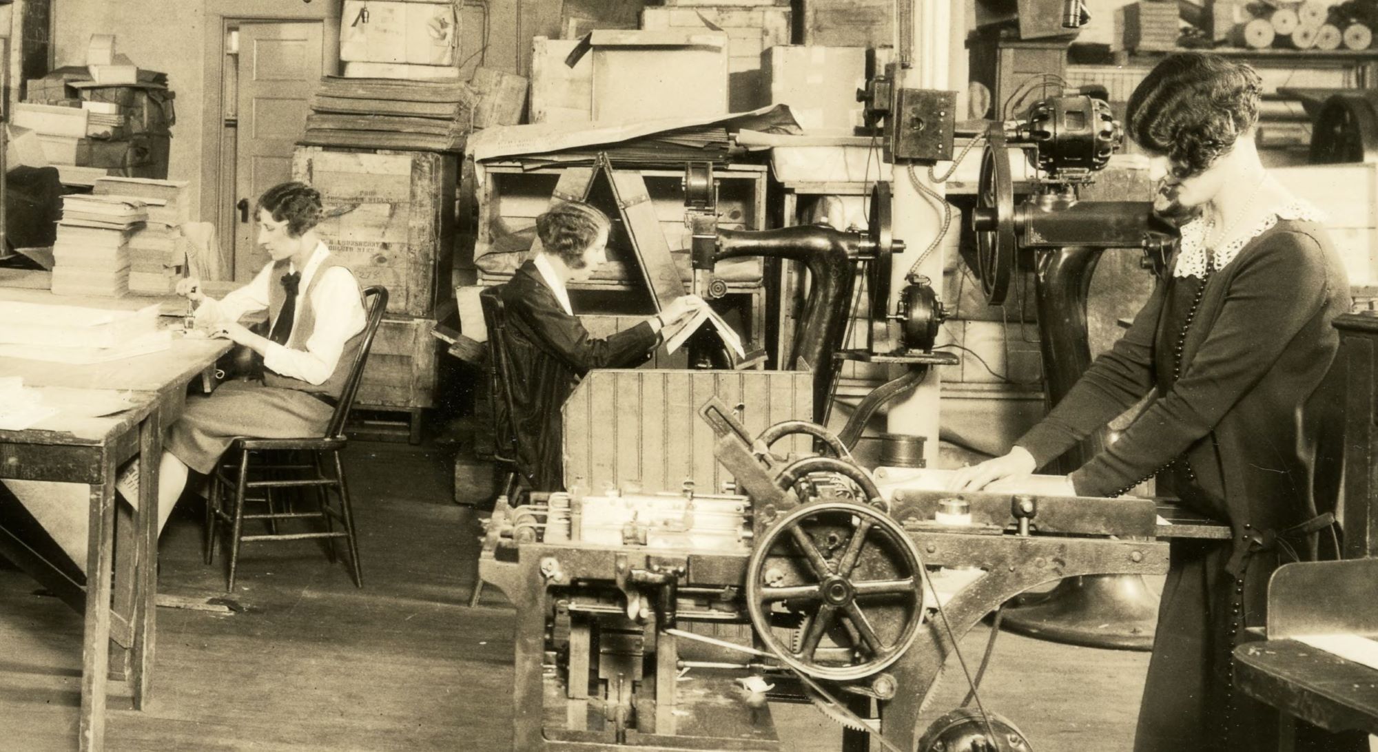 The work in the bindery falls into two classes. First, the work done by men. Here we find the paper cutters, folding and ruling machine operators and binders, the binding requiring much skill in administering the last touches for which high wages are commanded. Then there is the woman’s department in glaring contradiction to the old adage that “woman’s place is in the home”. Here we find women and girls from the ages of eighteen to forty-five. Some of them are married and have children, but work because they find their husbands earning inadequate for the household.