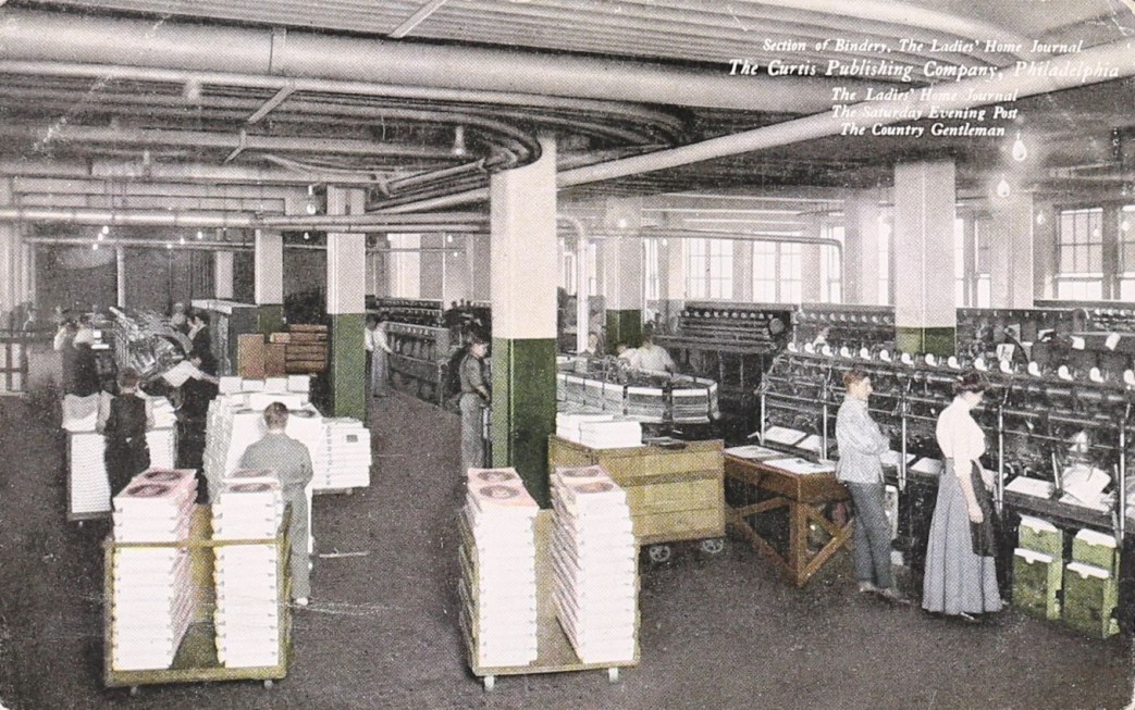The women’s part of the bindery work consists of hand folding, inserting and gathering. Wire stitching is an important feature of the work, but with the installation of machines that automatically stitch and insert as well, the girls who do this work, skillful, only after years of experience, find themselves gradually displaced. This new machine requires one girl for each section of a pamphlet and one for the cover. Because of the speed with which the finished booklets come out of the machine, two girls are needed to take them out of the packer, count stack them on a truck for the shipping room. With the help of no more than six or eight girls, this machine does the same amount of work in ten days that the girls alone would do in five or six weeks.