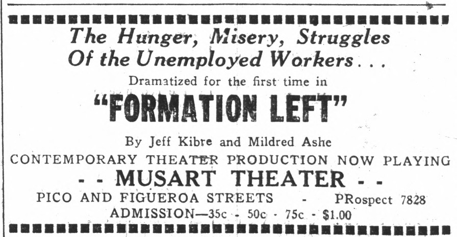 The presentation of Formation Left by the Contemporary Theatre in Los Angeles is an event in the history of the American theatre; it is, we believe, the first time on the Pacific Coast, and one of the few times in American stage annals, that a locally written and produced full-length play, giving an intelligent analysis of contemporary conditions, has been staged outside of New York.
