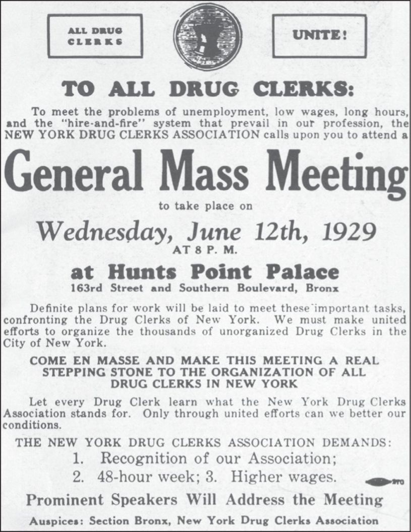 The New York Pharmaceutical Conference is acting as the spearhead in the present crusade against the union movement. It pours out torrents of demagogy and lies against it. Moreover, it has been attempting to behead it by organizing an auxiliary association of drug clerks under the guardianship of the Conference, i.e., a company union in its crystalline form. A serious challenge to the union movement among the drug clerks, however, cannot come from such an anemic organization as the New York Pharmaceutical Conference. Its whole existence has been an expression of impotence of the disorganized and prostrate drug industry. The real danger, however, is lurking from within the boundaries of the present “leadership” of the Drug Clerk’s Union.