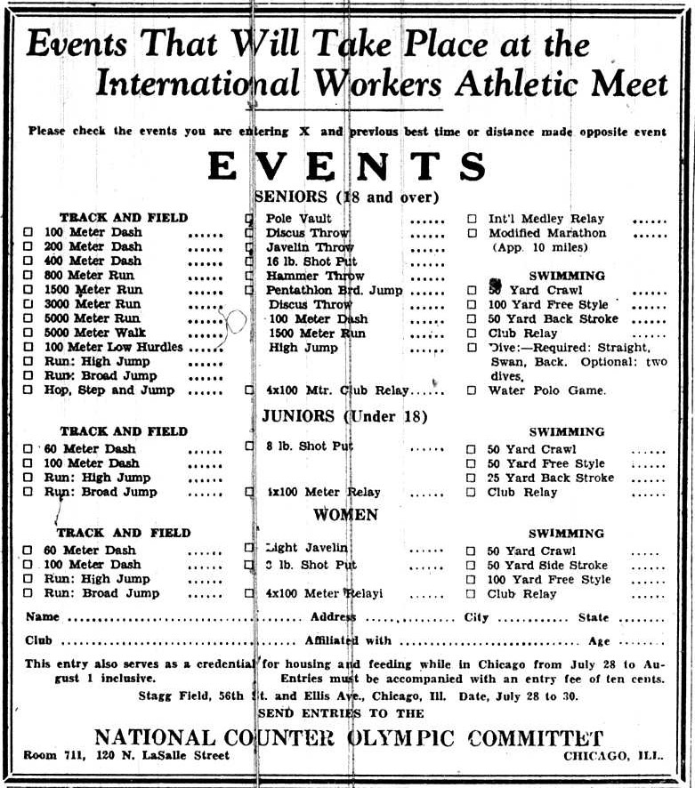 But the masses of workers in Chicago and vicinity fully realize the international importance of the Workers’ Sport Meet in Chicago. Every worker in Chicago and vicinity shall consider it his or her duty to come and bring others to participate in the Counter Olympics.