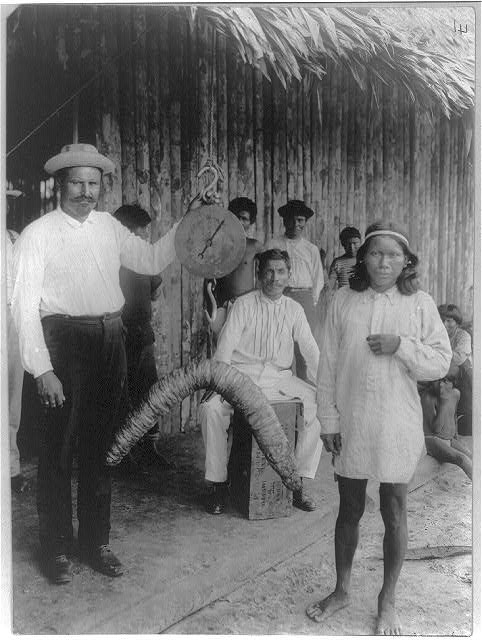 Although the conditions of labor differ but slightly in these two periods, yet for a definite reason we must analyze these two periods separately. Up to the end of the first period Brazil was one of the largest producers of rubber and the labor conditions were determined by the rubber-gathering concerns. The Indian workers were not employed on plantations, for no rubber trees were planted in Brazil. The trees grew in a wild state around the Amazon Valley, and the natives had to penetrate the jungle to gather the milky white “Latex.” They perfromed this work unwillingly. They were forced to gather the rubber under the threat of death. Whole communities of Indian workers were murdered by the rubber pirates—the Peruvian Amazon Company (a British concern). This is what the British ambassador wrote to the United States secretary of state, May 8, 1911: