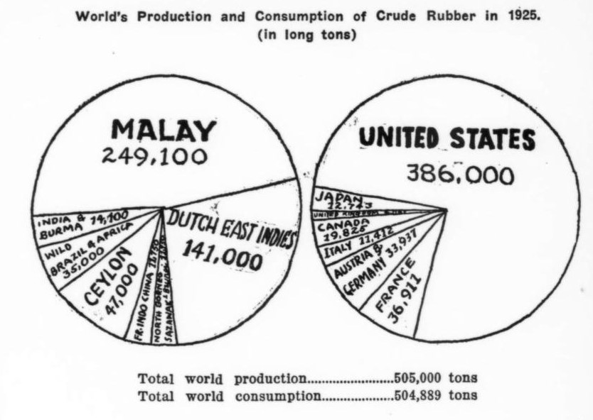 In 1925, the composition of the world’s rubber supply was different. Of the total rubber production of 505,000 tons, 35,000 tons or 6.3% was wild rubber, while plantation rubber amounted to 470,000 tons or 93.7%. With the change in the composition of the world’s rubber supply also changed the place where rubber was produced. Now the main sources of supply are the Straits Settlements and the Dutch East Indies.